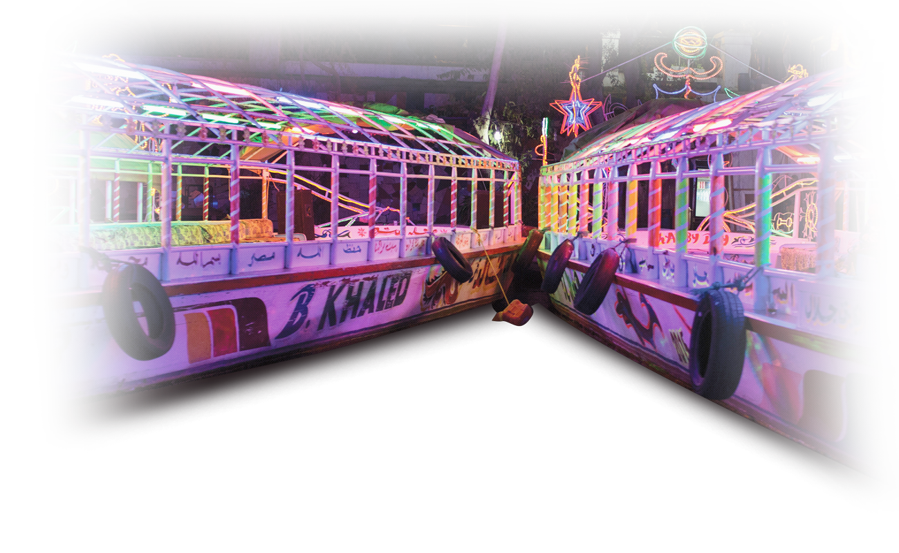 Shoka. El Basha. Beksho. Apart from their different names, the motorboats can also be distinguished from each other by their decorations. Bakkar, for instance, has green light strings spelling out allahu akbar – and a colourful, pipe-smoking and hat-wearing bird accompanied by two orange fish. His pipe smoke lights up with each loud beat of the pumping music.